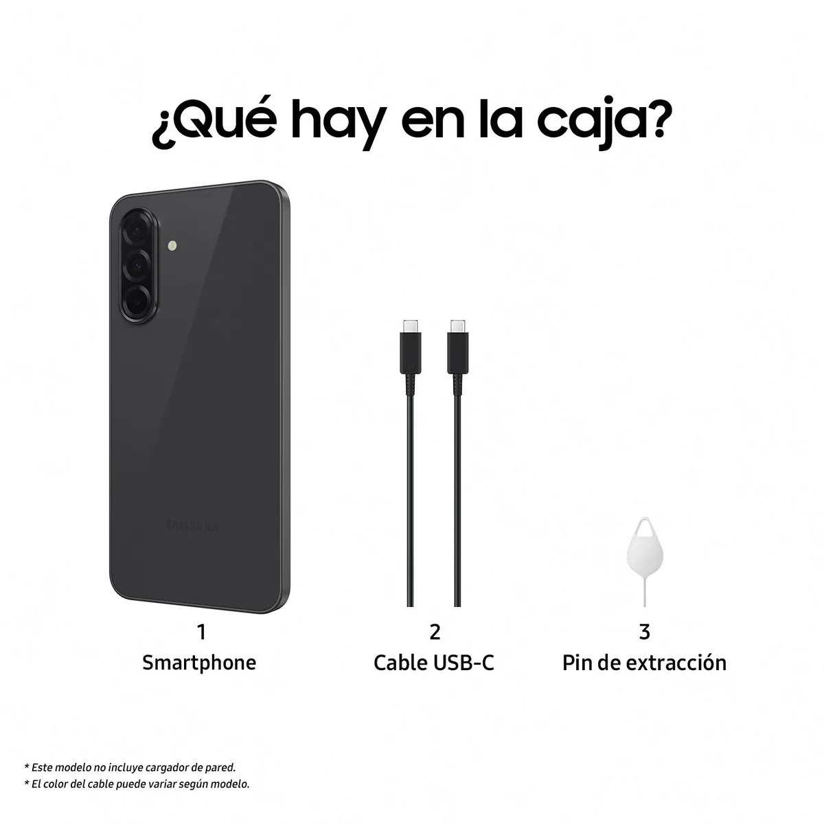 *Comprueba la siguiente tabla para comparar las especificaciones de los distintos modelos. El área de visión real es menor debido a las esquinas redondeadas y al orificio de la cámara.*Las opciones de memoria/almacenamiento y la disponibilidad pueden variar según el país, la región o el operador.*La duración real de la batería puede variar en función del entorno de red, los patrones de uso y otros factores.*La capacidad de memoria/almacenamiento disponible está sujeta al sistema preinstalado.*El cargador de pared para carga superrápida (45 W) se vende por separado.EspecificacionesCapacidad de almacenamiento 128 GB Duración en condiciones previsibles de uso 4 años Productos en combo No Modelo comercial Galaxy A36 Color Blanco Sistema operativo Android Características de la pantalla Super AMOLED Tamaño de la pantalla 6.5 pulgadas Tasa de refresco 120Hz GPU 8 Nucleos Memoria RAM 6GB Memoria expandible No aplica Cámara posterior No aplica Cámara frontal 12MP Capacidad de la batería (en mAh) 5000 mAh (45W Carga rápida) Carga rápida Sí Carga inalambrica No Carga inalambrica inversa No Generación 5G NFC No Resistente al agua IPX6 (Protegido contra chorros a alta presión) Reconocimiento facial No Lector de huella Sí Ranura para SIM Double SIM eSim No Tamaño de SIM Nano SIM Plazo de disponibilidad de repuestos 7 años Plazo de disponibilidad de servicio técnico 7 años Cantidad de paquetes 2 Condicion del producto Nuevo Garantía 12 meses País de origen Vietnam Modelo SAMSUNG